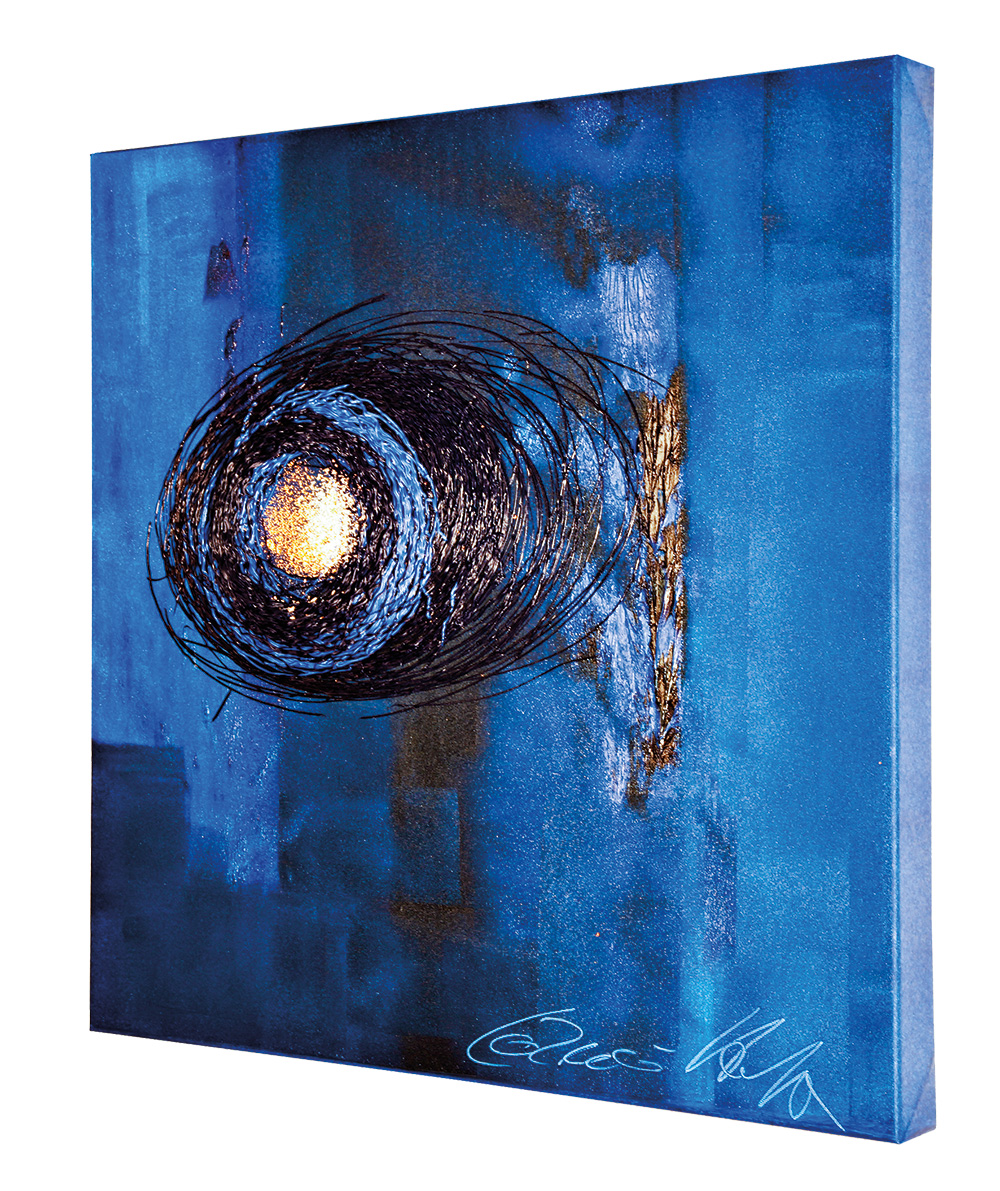„Golden and silver nucleus & blue rings in a blue room“ Maße 80 x 80 cm, erschaffen 2011, AIP auf Leinwand